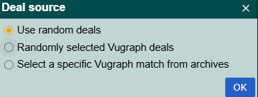 - The host can select the Deal Source - Random hands, Random Vugraph deals, Specific Vugraph