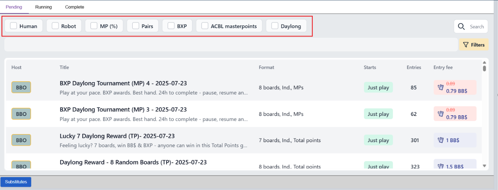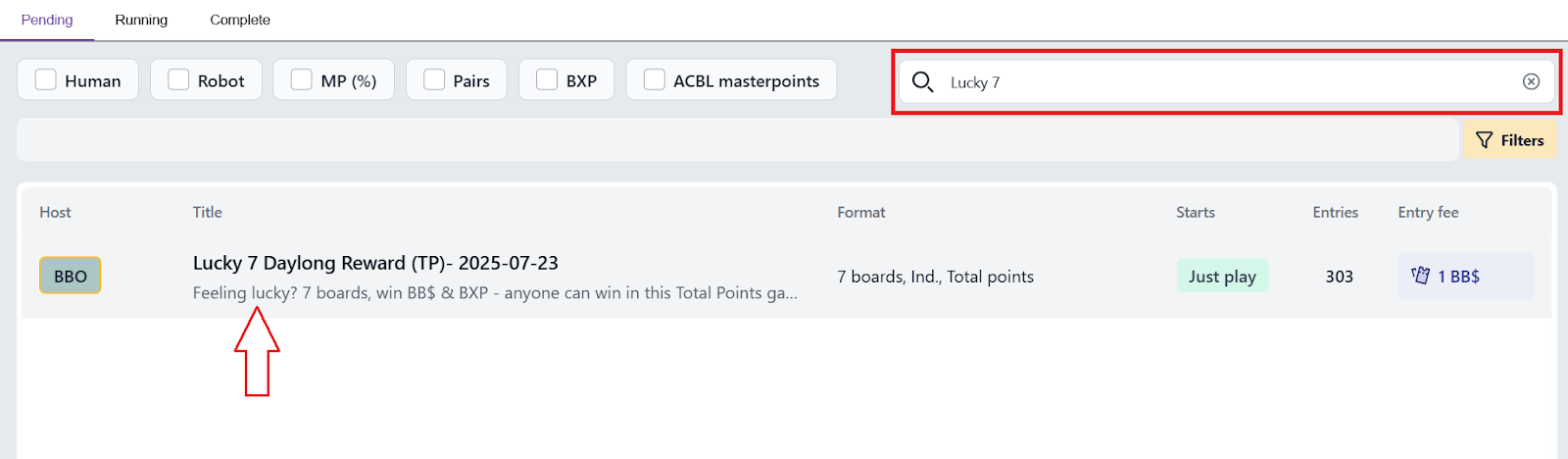 7- Just as always, you can use the “Search” box to look for a specific game, if you know its name, or its host, or other detail (type Country to find Country vs Country tournament, vacb12345 or EBU to find tournaments hosted by them, or type “Swiss” to find that tournament type.