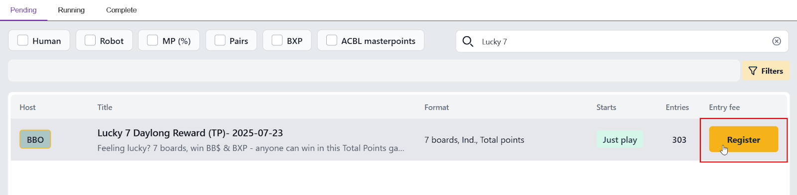 8- Once you’ve found a game you want to join, click 'Register'